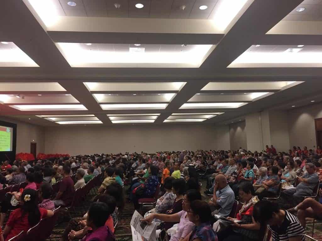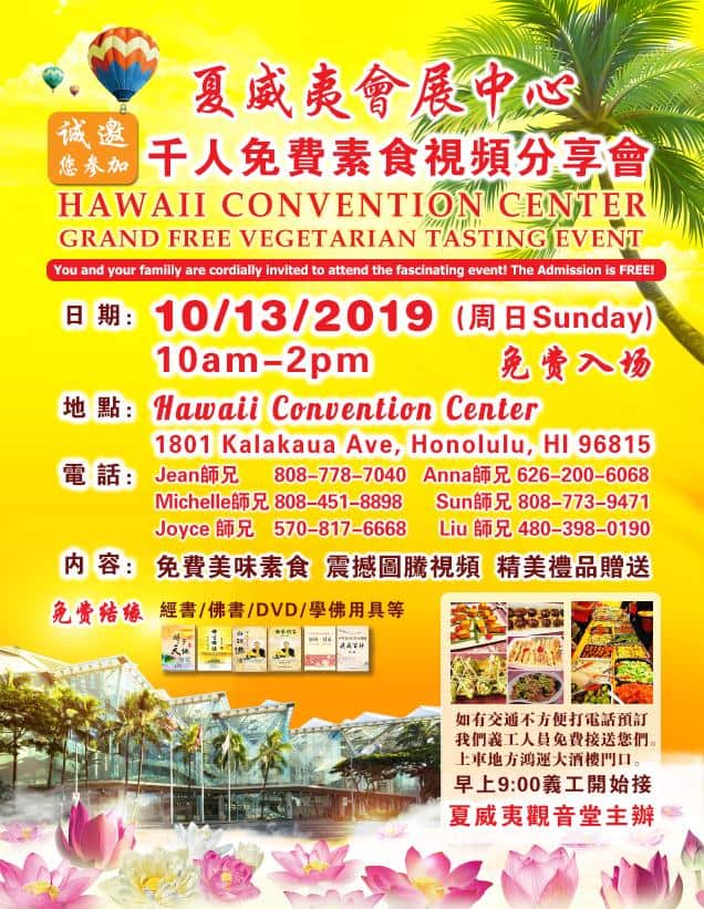 10月13日中午,夏威夷会展中心的一场“素食涵养心灵之美”的交流分享会吸引了千余当地民众参加。本次活动由夏威夷观音堂筹办,入场门票、美味素食、佛学书籍、光碟佛具等全部免费与大众结缘,为方便往返交通不便的来宾,义工们还提供了热情周到的接送服务。